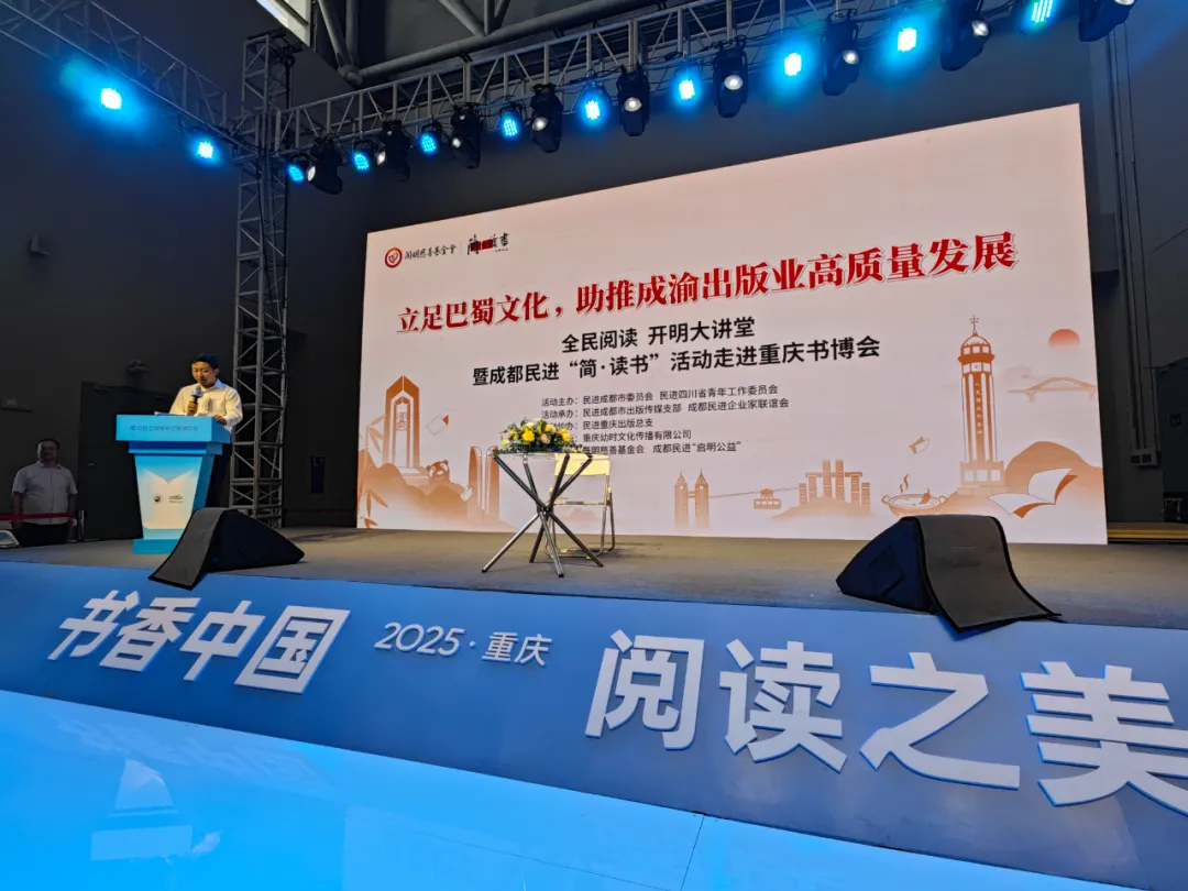 7月26日,“全民阅读·开明大讲堂”第二期活动在重庆国博中心开讲?;疃匮拇ㄊ≌氖费芯抗葑噬罟菰薄⑸缈圃喊褪裎幕紫姨芳毯?,以“立足巴蜀文化,助推成渝出版业高质量发展”为题发表主旨演讲。时值第33届全国图书交易博览会,开明大讲堂与书博会同频共振,吸引大批参展机构和读者的热情关注,线上线下1000余人次观看。